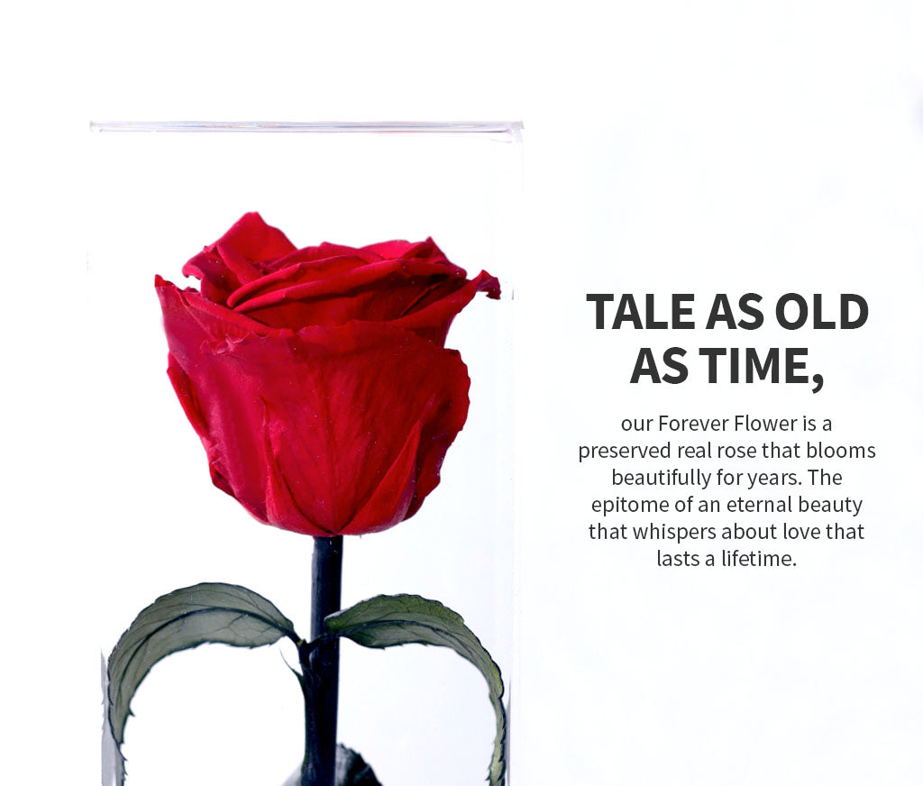 Setangkai Mawar pilihan yang dipetik oleh tangan para ahli bunga kami secara teliti, kemudian diawetkan melalui serangkaian proses alami sehingga dapat sampai di tangan Anda dalam kondisi sempurna, layaknya bunga segar yang mekar di taman. Hadir dalam varian warna Passionate Red yang melambangkan keabadian cinta. Dipajang dalam kotak akrilik transparan yang membuat Anda selalu dapat mengagumi keindahannya. Dikemas eksklusif dalam kotak premium dan dihias dengan pita yang menambah kesan mewah dan elegan.