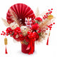 Perpaduan Kipas Merah Berukuran Besar, Peony, Bunga-Bunga Merah, Dedaunan Emas, Berry, dan Ornamen Oriental