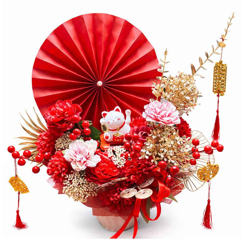 Maneki-Neko in Vase menghadirkan harmoni antara keanggunan dan kekayaan nuansa oriental. Bunga bernuansa pink dan merah yang elegan dipadukan dengan hydrangea, aksen emas, serta berry yang mempercantik tampilan. Di bagian tengah, figurin Maneki-neko menjadi simbol sambutan hangat untuk keberuntungan dan kemakmuran. Latar kipas merah yang bold serta ornamen emas yang menjuntai melengkapi rangkaian dengan sentuhan perayaan yang anggun. Sempurna sebagai hadiah Tahun Baru Imlek yang bermakna atau dekorasi elegan untuk menyambut berkah di setiap ruang.