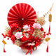 | Isi | Soft pink and deep red blooms, gold accents, hydrangeas, berry stems, Maneki-neko figurine, red fan, golden ornaments |